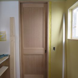 加古川市のMa様邸では大工さんの造作工事もあと少しとなりました。 2階にはご主人の書斎コーナーを造り付けました。 カウンターにはタモの幅ハギ材を使用し、上部に...