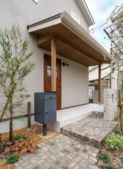 アンティークレンガと瑞々しい植栽が調和する緑豊かなアプローチ。玄関横まで大きく広がる庇の下は、自転車を雨から守る駐輪スペースとしても活用できます。