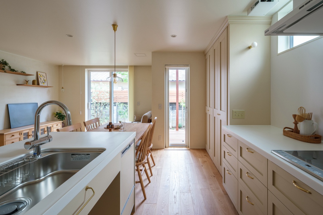 家族みんなでキッチンを囲めるⅡ型のレイアウト。家具のように美しい造作キッチンに、真鍮のハンドルが上品なアクセントを添えます。