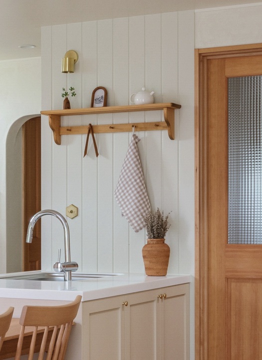 ペイントの板壁に無垢の木のシェルフ。実用的なキッチン道具もお気に入りの雑貨も一緒に飾って楽しめるキッチンのディスプレイコーナーが、毎日の家事の時間に彩りを添えてくれます。