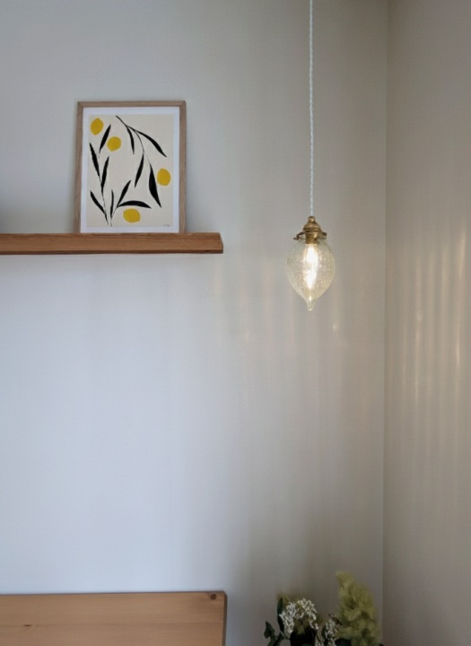 アクセントとなるデザイン照明や、アートポスター等も併せてご提案しています。レモン型のペンダントライトは、点灯すると壁に光の紋様が広がってリビングの表情を一層豊かにしてくれます。