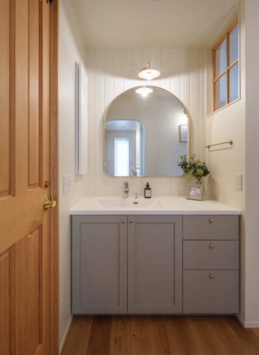 海外のホテルのような洗面デザイン。帰宅動線上に設けられた洗面は、ニュアンスグレーの造作洗面台にゴールドのアーチ型ミラーを合わせて、華やかさと落ち着きを演出しました。